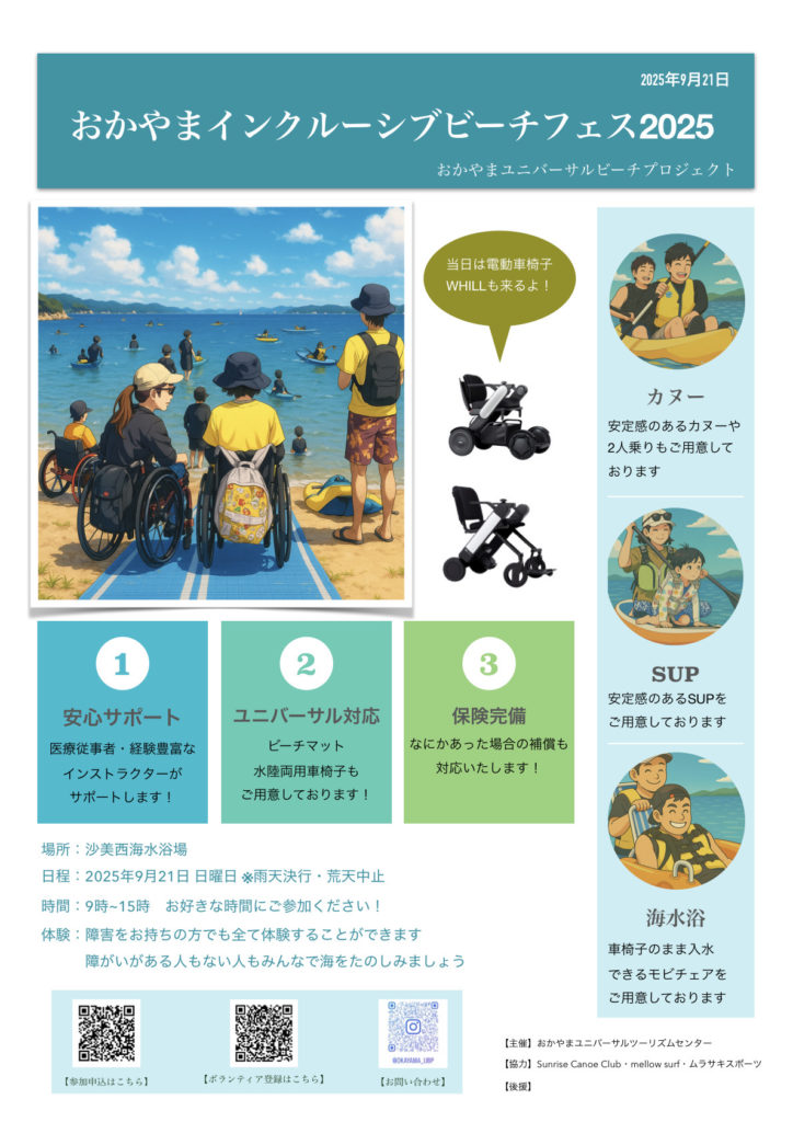 私がこの「インクルーシブ」という単語を知ったのは「おかやまインクルーシブビーチフェス」というイベントにナミさんがボランティアとして参加していたから。興味本位で渋川海岸に見学に行ってみましたら、障害を持った人がマリンアクティビティを楽しんでいる姿に衝撃というか感動というかなんとも言えない楽しい気持ちになった事を覚えています。