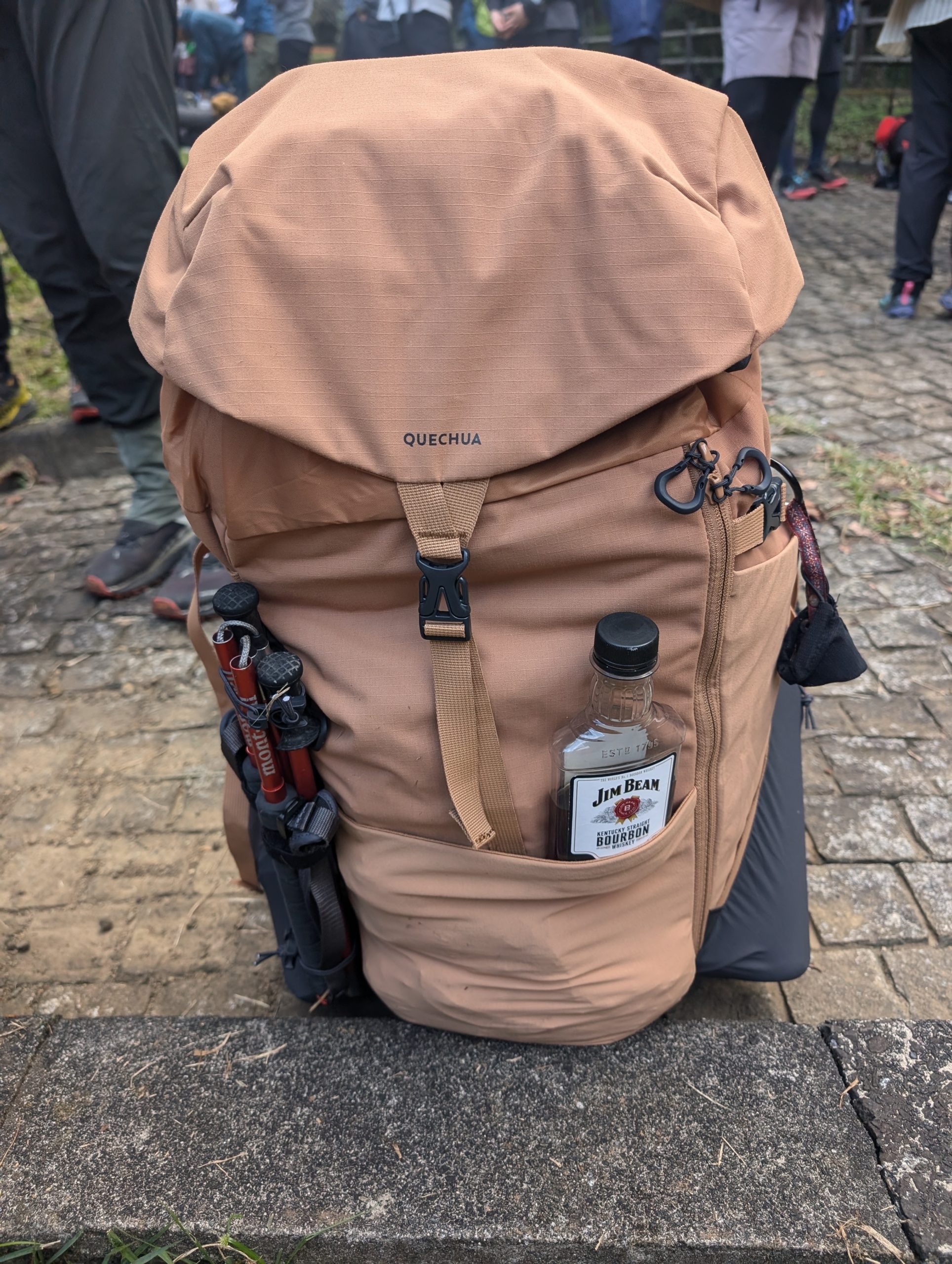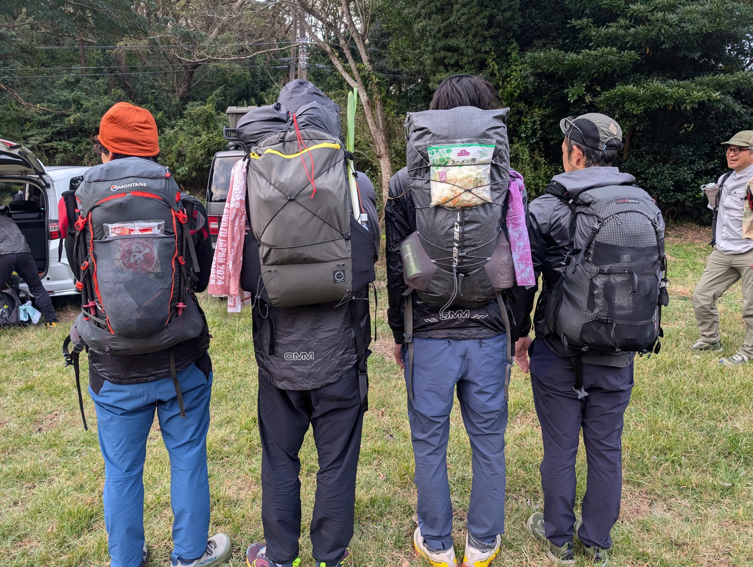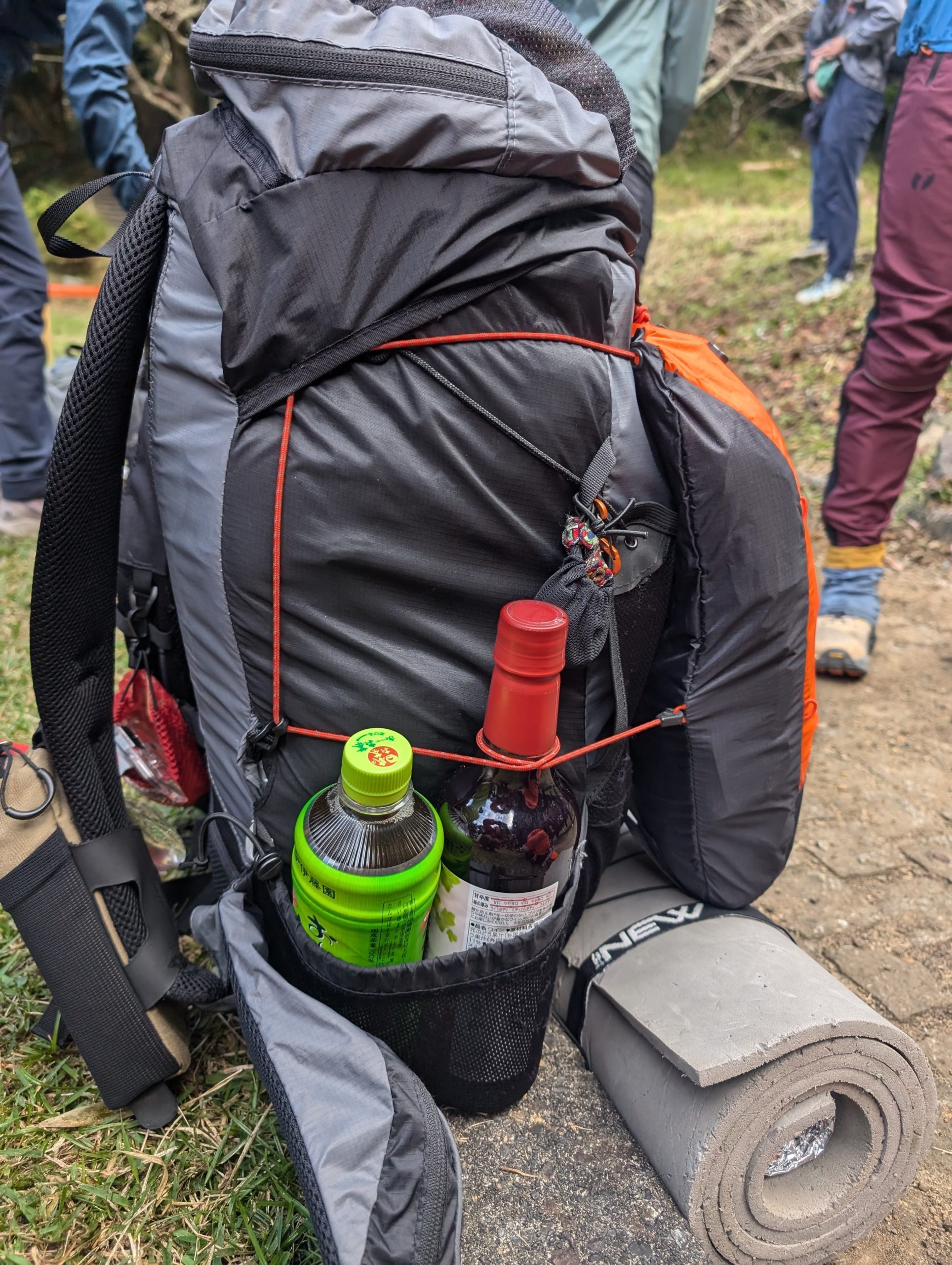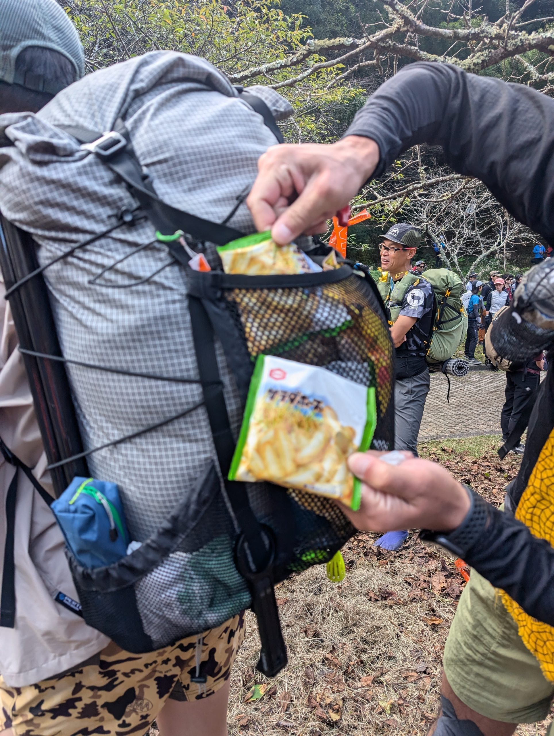 食べ物をザックの外側に挟んでいる人を